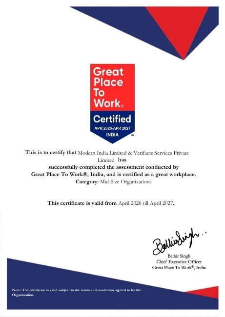 Modern India Ltd. is a  Great Place to Work® certified company that fosters a high-trust, high-performance culture where employees feel valued, respected, and empowered. We prioritize employee well-being, promote open communication, and cultivate an inclusive environment that encourages innovation, collaboration, and personal growth. Our leaders are transparent, approachable, and aligned with core values, creating a strong sense of purpose and belonging among teams.